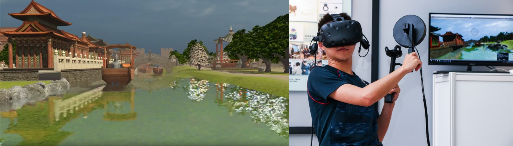 | 作品描述 | 根據故宮古畫《宋趙伯駒上苑春遊圖 卷》、《宋人集繪 冊 宋馬永忠水榭荷香》,以及《宋人漁樂圖 軸》,將宋時開封人在金明池的垂釣體驗重現於VR,帶玩家回到宋朝釣魚,體驗開封人「臨水斫膾,以薦芳樽」之樂。《漁樂》是一款讓玩家回到過去,體驗宋朝庭院垂釣之樂的遊戲,透過遊戲裝置給予玩家力量方向、大小,以及視覺上的反饋,使其身歷其境。遊戲一開始藉由簡短的開場動畫,帶領玩家瀏覽遊戲環境,指引玩家拿取釣竿後,遊戲視角轉向湖面,以浮標開始遊戲。玩家依據浮標與水面的變化判斷魚是否上鉤,待魚上鉤後須立即轉動釣竿的握把收線,這段和魚隻搏鬥的過程,釣線會隨著魚隻游動方向和遠近而產生不同力道及方向的拉扯。收線時轉動握把的力道也會因而改變,魚拉扯釣線越用力時,握把越難轉動,當玩家收線至一定圈數,魚隻則上鉤;反之魚隻則脫逃。遊戲最後以料理後的魚隻上菜宴客的動畫作為結束,讓玩家體驗辛苦收穫後「臨水砟膾」的過程。遊戲給予玩家的體驗目標在於宋朝庭院垂釣之樂,除了時代環境設定所提供的視覺體驗外,還有釣魚時與魚搏鬥過程,釣竿給予的力量反饋。 |