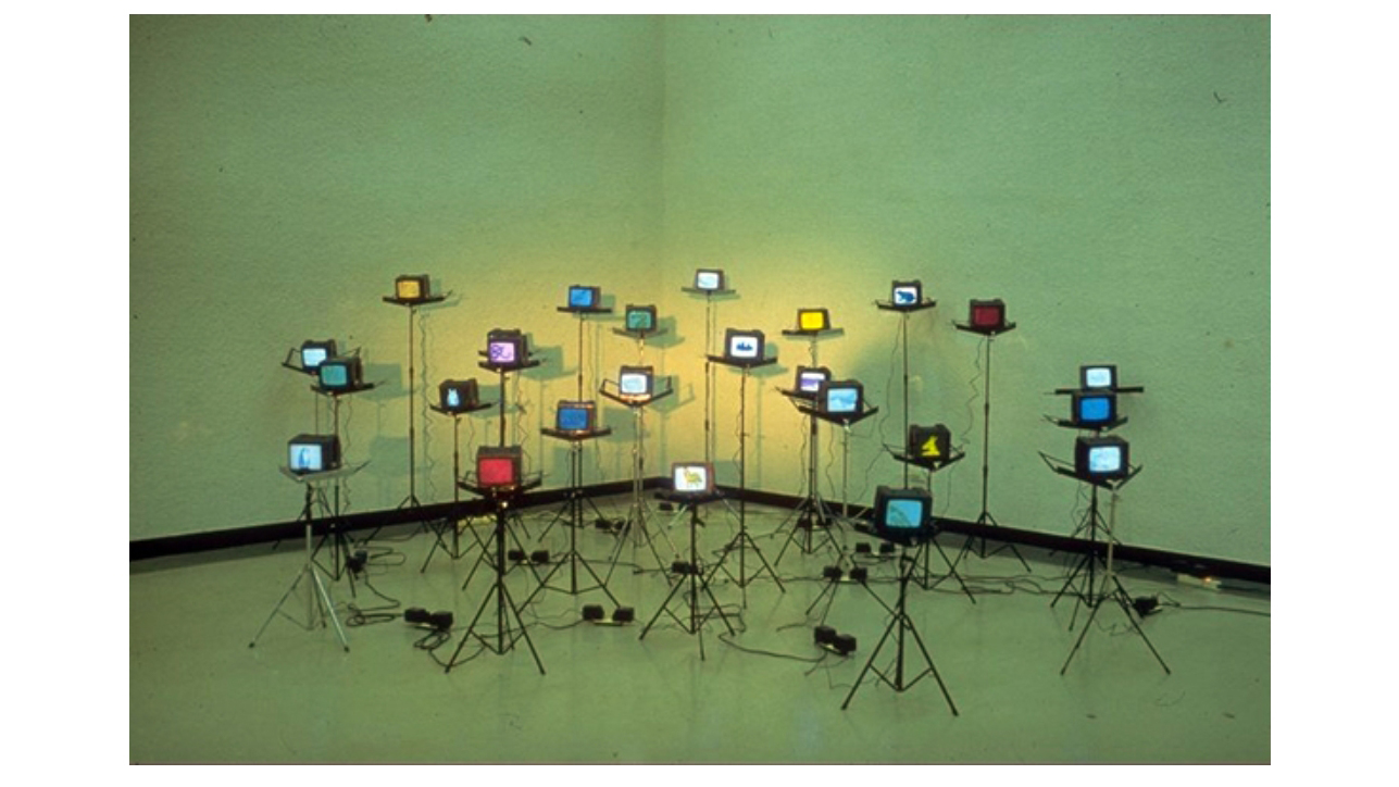 | 作品描述 | 1991這件作品《交響樂團》主要是一個集體演奏團的想法,所以運用了電視還有樂譜架,放上生物的內容。而有次伊通公園的成員與誠品商業空間合作,請我們選擇一件詩人的一首詩來進行創作,我就選擇了一首內容有鳥的的詩進行創作,比較偏環境綜合的作品。