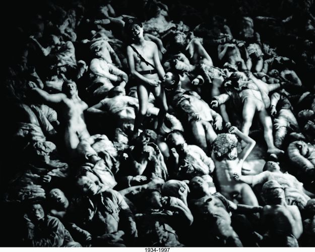 | 作品描述 | 《失聲圖》是陳界仁所創作「魂魄暴亂:1990-1999」系列中的一幅,以早期「中央通訊社」一幅匿名攝影記錄為基礎,於1997年將該攝影記錄輸入電腦,重新編排、重組,並將自己的影像一併納入結合而成。該匿名攝影記錄成堆的匿名屍首,陳氏透過電腦繪圖將自己的影像納入其中,並以古典的三聯幅方式呈現。在屍首成堆的影像中央,矗立著的是不知是哭是笑的癲狂陳界仁。這些死去的人是誰?為什麼而死?攝影的人是誰?……將永遠是個謎。而這些人(包括死者與作者)也都永遠失去說明的機會。一個永遠的「失聲圖」。