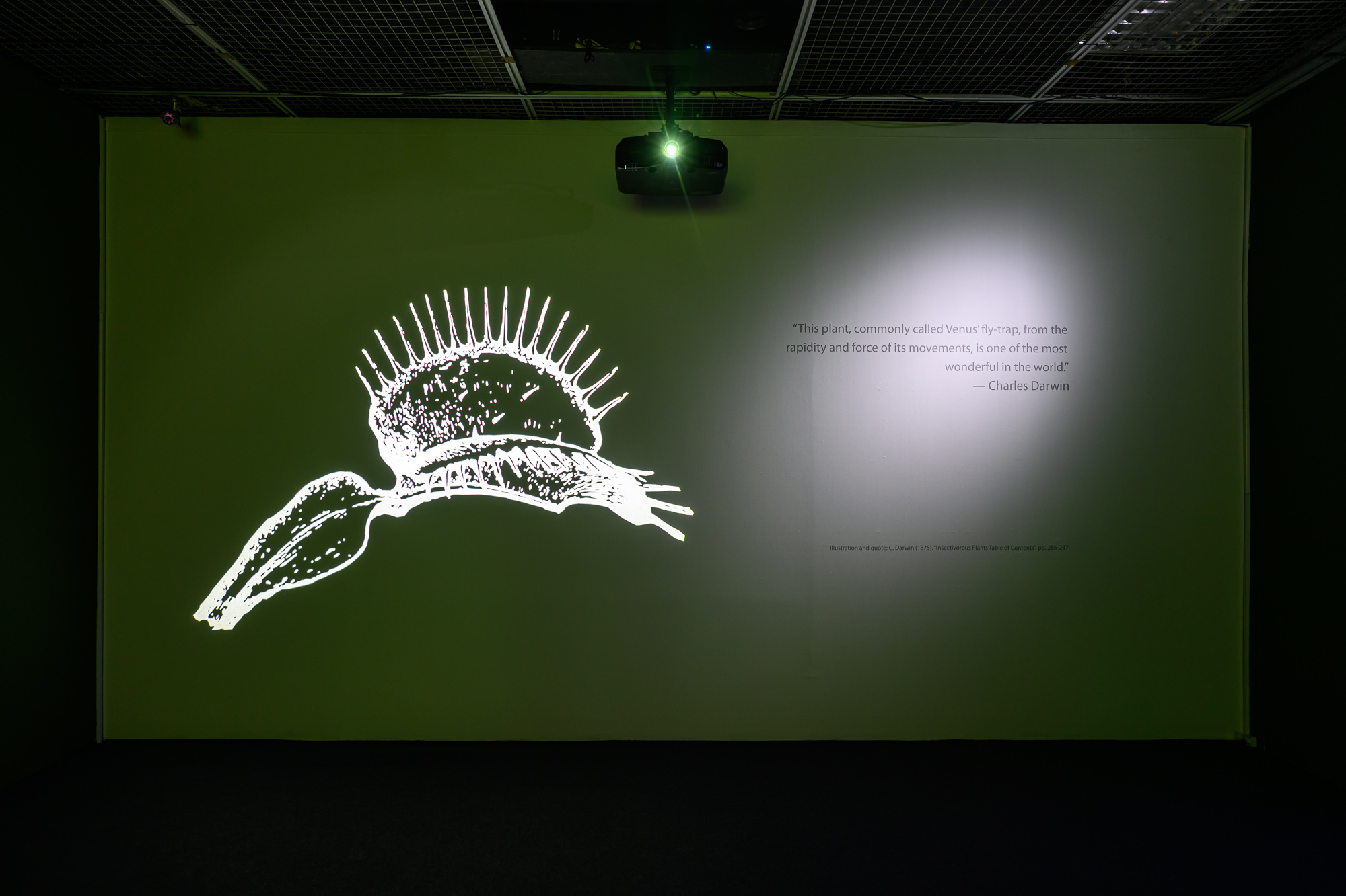 「捕蠅草」因為葉片邊緣的刺毛有如維納斯的睫毛,又稱為「維納斯的捕蠅陷阱」,食蟲植物的主動誘捕習性,不同於一般植物被視為被動受害的物種,而師法「捕蠅草」進行人類改造,有企圖翻轉生物階層論將植物歸類為較低等生物與女性被動的象徵迷思。從「捕蠅草」等食蟲植物的特化捕食器官進行基因研究,在後人類的營養獲取方式與覓食方法上,呈現生物基因混種改造與人工器官培養的模擬。在性與死亡、食慾與性慾中發現了引誘、合作與欺騙的共同天性,創作者引用 NCBI資料庫查詢到「捕蠅草消化液」與喚起人類性功能相關的「精胺酸酶」之蛋白質晶體結構,再藉由女性外陰與捕蠅草開合的符號隱喻,在食慾和性慾之間潛藏的生命動力關係之間,發展為「後維納斯身體」所生成的慾望陷阱。 節錄自:https://reurl.cc/nYMv6l |