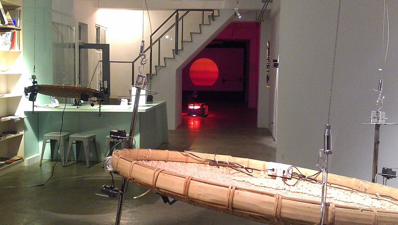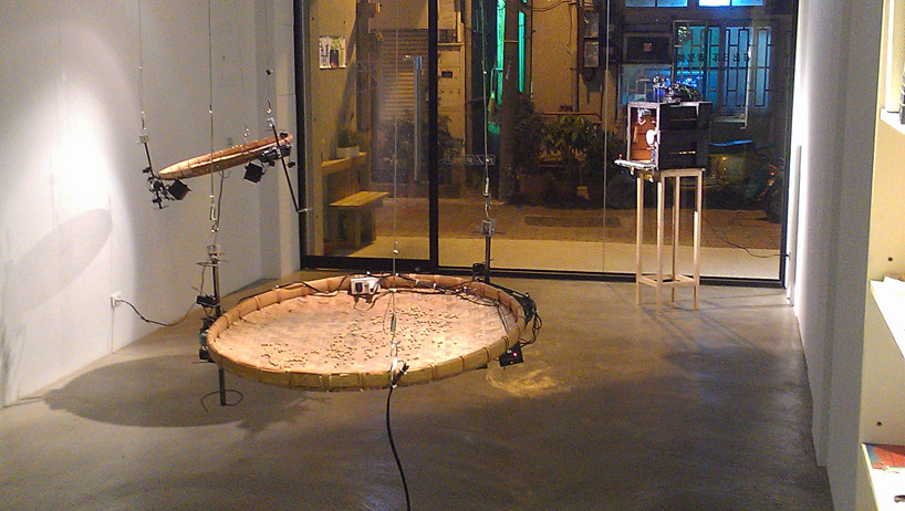 三組懸垂在展場中以機械控制緩慢搖動的竹篩,如海浪般不斷的搖擺波動,在竹篩中不斷遊走的豆子,製造出一波波如同浪潮拍打海岸的聲音,偶爾從展場角落還會傳來像是來悠揚的輪船汽笛聲。