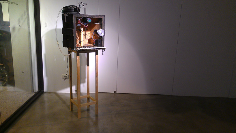 現代工業文明的發展,永遠地改變了大家原本的生活方式和身邊的環境。大自然的景色逐漸消逝不再,吵雜穿梭的人車雜沓取代了記憶中的鳥叫蟲鳴。為了重現幼時記憶中的情景,我試著在工業文明的機械產物所製造出的噪音和燈光中去尋找,藉由投影機和拆船五金零件所組成機械裝置,製造出一波波的浪濤和遠處的船笛聲,在這空間中營造出兒時記憶中漫步在海邊夕陽下的氛圍。試圖藉著這個以人工方式營造出的自然美景,來反諷人類為了追求工業與科技文明的發展,而不斷去破壞身邊珍貴的自然環境的盲目行為。