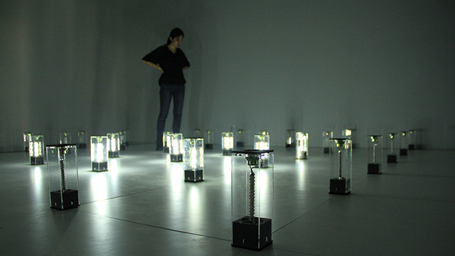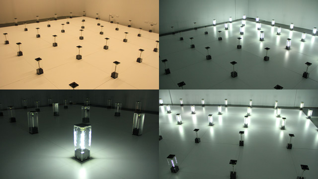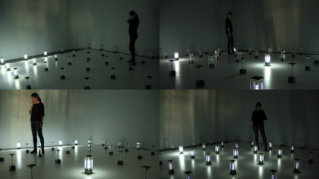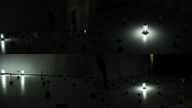 | 作品描述 | 我們用冗長的時間在我們所存在的空間(城市、街道、家、房間、網路)中漫遊,日復一日將昨日的種種複製而成今日。旅行,我們的感知夾在現實移動與心靈穿越之間。現實世界與心靈世界中,我們的行為像似平行宇宙的關係,相互影響、依存。雖然我們僅用單一感知去感受兩個不同的世界… 這件作品是一件光影、聲音互動裝置。49個光源音效裝置陳列在7公尺乘以7公尺的矩陣裡,每一個光源音效裝置以透明壓克力為主要結構,並配置獨立聲道及獨立迴路的LED燈。在一個四面皆為白牆的空間裏,觀眾可以任意穿梭在光源音效裝置的矩陣之中。LED光源投射在牆面上,照亮這個空間,同時也將其他裝置單元及觀眾的影子映落在四面牆上。作品中的聲音與光源不斷改變其在展演場所中的位置,裝置單元及觀眾的影子因著自己的位置及發光點的關係而產生閃爍、隱現、重疊、位移…等豐富的層次變化。聲音、光、觀眾、影子彼此互動而產生音樂性節奏,進而建構成一個擁有聽覺性、視覺性及三度空間性的音樂光影劇場。裝置單元的影子像似快動作地呈現城市裡的建築物的起起落落及改變,也像似在交通工具上,窗外快速流過的城市光景。而觀眾的影子則是庸碌繁忙的城市居民及過客。 這件作品除了可執行編寫好的燈光音效撥放程序,更希望創作計劃本身能因地因人而展現作品不同的面向,成為一個能與其他藝術家、表演家、音樂家、互動程式設計師共同創作的遊戲場。在里昂展出期間也將與當地舞者合作,共創一場互動式舞蹈表演。 |