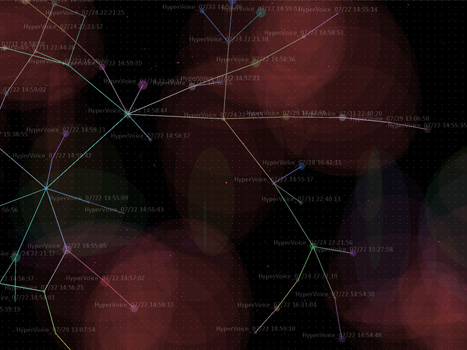 | 作品描述 | 《超聲鏈》以「人聲溝通」為主題之互動裝置創作。「溝通」是人與人、人與群體、人與社會之間的思想與感情間交互作用之過程。人類的有聲溝通由最原始的口耳相傳至留聲機,乃至於有線電話,科技發展與前進,現在已邁入無線溝通的時代。《超聲鏈》以手機作為一種媒介,透過手機錄製人聲,以連線裝置播放聲音、呈現人聲視覺化的影像,表現「聲音訊息脈絡與時間的關聯」。 每位觀眾參與互動時,可使用手機隨時錄製聲音或播放先前觀眾留下的人聲訊息,當觀眾聽了被記錄的人聲訊息或進行錄製聲音,則會影響下一個聲音的內容,因此人聲訊息之間產生了鏈結。 人聲訊息內容之間的關聯性,因錄音時間上的不同,產生非線性時間上縱橫交錯溝通的可能性。當多位觀眾互動時,音軌不斷的增疊,播放的聲音及現場的呢喃聲也同時被錄製,此錄音產生的聲音同時包含了不同時間、人、內容的超時空人聲溝通。 |