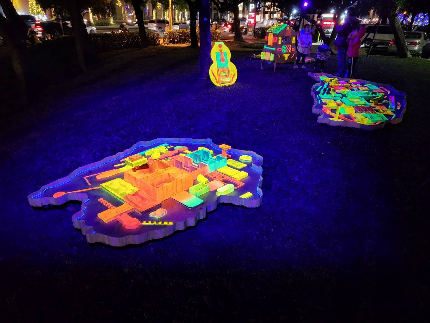 作品描述 本作拼裝物件原始的塗層色彩與在夜晚所散發的螢光代表白天與黑夜兩個概念,白天的城市文明與夜晚都會不夜城相互對應,一座城市反應著兩種面相,進而啟發觀者反思。這些生活模組物件被安置在具臺灣本島、臺中市與臺南市地圖外型的基地之中,並拼組出都會城市與廟宇神殿的樣貌,隱喻人們在都會文明中的壓抑及殘酷的現實壓力與精神寄托的交織。